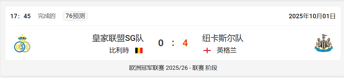 皇冠大全 2025年10月01日皇家联盟SG队纽卡斯尔队:足球比赛概述与实时更新 皇家联盟SG队 (比利時) 与 纽卡斯尔队 (英格兰) 之间的足球比赛于星期三 2025年10月01日 在 17:45 结束,比分为4 : 0,有利于 纽卡斯尔队。这场比赛是 联赛 阶段 的一部分欧洲冠军联赛 2025/26。 由于比赛已经结束,因此皇家联盟SG队对阵纽卡斯尔队的投注已不再接受和可用。