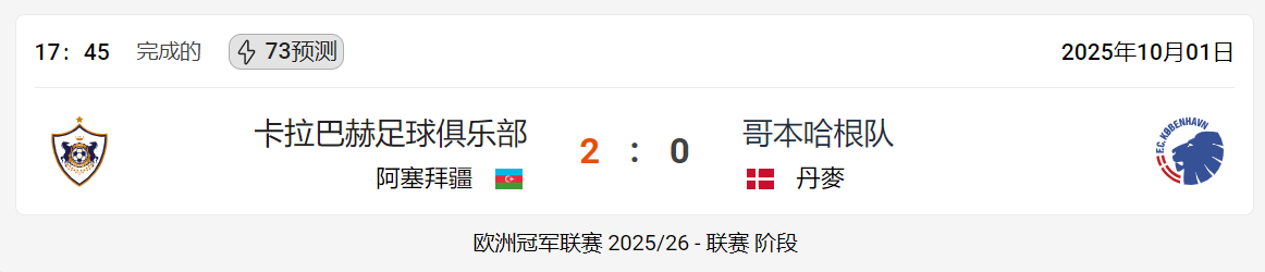 皇冠大全 2025年10月01日卡拉巴赫足球俱乐部哥本哈根队:足球比赛概述与实时更新 卡拉巴赫足球俱乐部 (阿塞拜疆) 与 哥本哈根队 (丹麥) 之间的足球比赛于星期三 2025年10月01日 在 17:45 结束,比分为2 : 0,有利于 卡拉巴赫足球俱乐部。这场比赛是 联赛 阶段 的一部分欧洲冠军联赛 2025/26。 由于比赛已经结束,因此卡拉巴赫足球俱乐部对阵哥本哈根队的投注已不再接受和可用。